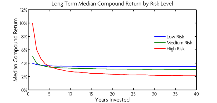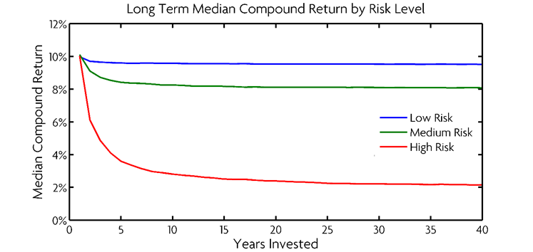 Consider the following Monte Carlo simulation experiment: we have three funds to choose from, all with 10% annual expected return. Their risks are low (10%), medium (20%), and high (40%), as measured by annualized standard deviation. Over time, the riskier funds tend to exhibit more negative single-period returns, with this tendency becoming certainty as the investment period becomes longer. In a simulation of 1,000,000 possible histories, the median realized annual returns are shown in Figure 1.