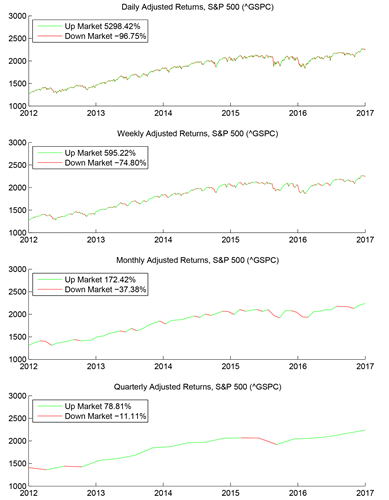 - Upside and downside returns themselves are not well defined, and can vary extremely based on the return period, i.e. daily, weekly, etc.. A close examination of price movement shows that fluctuations occur at many time scales, and both upward and downward price movement can be observed within smaller and smaller time periods. To demonstrate the difficulty in assigning “up market” and “down market” periods, consider the accompanying figure (below), in which four panels show different period representations of the same index, the S&P 500 over five calendar years, January 2012 to December 2016. The quarterly representation, in the bottom panel, has only four down market periods, marked in red, with a total downside return of -11%. The daily representation has many up and down periods, with a total downside return of -96.75%.
