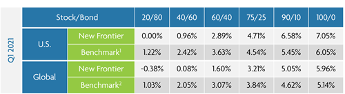The reality is that investors who have stayed in a portfolio of 60% U.S. stocks and 40% bonds have been rewarded. New Frontier’s 60/40 indices, which mirror our global and domestic balanced portfolios, reached all-time highs in 2021, and other indices show strong performance[1] over multiple time frames.