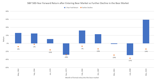 Using S&P 500 historical data from Jan 1960- May 2022, we were able to identify nine bear market events, with bear markets in this study defined as the first time a market drawdown is greater than 20% from the previous high. From there, we calculated the forward one-year return from that trigger event. Using this data, we found that the one year forward returns were deeply negative in only 2 of 9 such events (1973 and 2008), when the bear market continued through the following year. We also found that the (arithmetic) average one-year future return of all 9 events is approximately 13%, which compares favorably to the average 8% annualized return over the whole history; volatility, however was also higher over these periods. While investing at the onset of a bear market is no guarantee of positive returns, the higher average return accompanied with higher volatility is consistent with financial theory in which markets reward investors for taking additional risk.