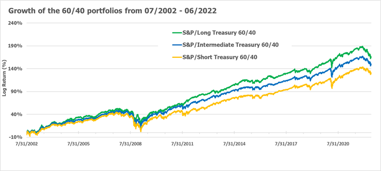 Sources: Bloomberg ETF daily returns (SPY for S&P 500, TLT for Long Treasurys, IEF for Intermediate Treasurys and SHY for Short Treasurys) from 2002/07/31 (inception date of the Treasurys ETFs) to 2022/06/30 are used to construct the 60/40 portfolios, with a quarterly rebalancing. PAST PERFORMANCE IS NOT A GUARANTEE OF FUTURE RESULTS.