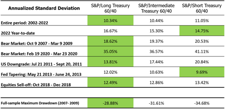 Sources: Bloomberg ETF daily returns (SPY for S&P 500, TLT for Long Treasurys, IEF for Intermediate Treasurys and SHY for Short Treasurys) from 2002/07/31 to 2022/06/30 are used for constructing the 60/40 portfolios, with a quarterly rebalance schedule. Portfolio standard deviations represent realized daily standard deviations in annualized terms. The highlights indicate the outperformance during the period. PAST PERFORMANCE IS NOT A GUARANTEE OF FUTURE RESULTS.