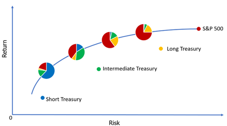 The chart below shows a hypothetical mean-variance efficient frontier for portfolios comprised of three Treasury bond ETFs and the S&P 500.The four optimal portfolio allocations on the frontier represent four target risk objectives - stock/bond ratio of 20/80, 40/60, 60/40 and 75/25, respectively. The proportion of long-term Treasurys in the bond allocation shifts higher for more aggressive portfolios even though the weight to bonds decreases overall.