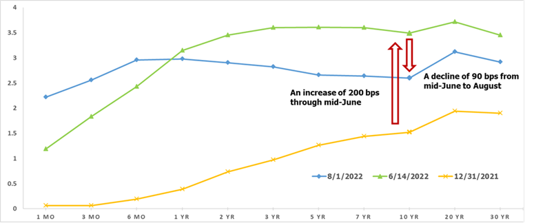 Bond investing has been challenging in 2022 due to historic macroeconomic events and significant interest rate hikes by the US Fed. The velocity of the yield change YTD has been stark, as illustrated below. For example, after an increase of nearly 200 bps through mid-June - with 10-year Treasury yields reaching 3.49% on June 14th - long-term yields declined by 90 bps in just thirty-three trading days to land at 2.6% as of the beginning of August.