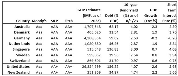 Table: Representative list of countries with best agency credit ratings, and some statistics related to treasury/sovereign debt bonds.