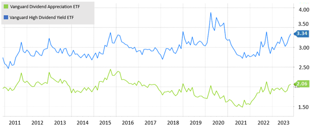 Choosing the right dividend fund starts with assessing its alignment with your income objectives. Dividend funds commonly focus on either capturing high dividend yields, dividend growth, or a blend of both. High dividend funds typically select high-yielding stocks based on trailing or recent dividends, whereas dividend growth funds typically restrict themselves to companies with a long history of increasing dividends. Consequently, dividend growth funds often have fewer holdings, more tracking error and lower yields. The reduced yield is illustrated below–over the past 13 years, Vanguard's US high dividend fund has consistently yielded approximately 1% more than their dividend appreciation fund. In general, dividend growth funds are unlikely to be sufficient for investors seeking immediate high income.