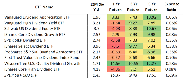 Source: Bloomberg as of 11/14/2023. The 10 largest dividend-oriented ETFs are selected, with the S&P 500 ETF included in the last row as a reference. The 12-month dividend yield and return are expressed as percentages. PAST PERFORMANCE IS NOT A GUARANTEE OF FUTURE RESULTS.